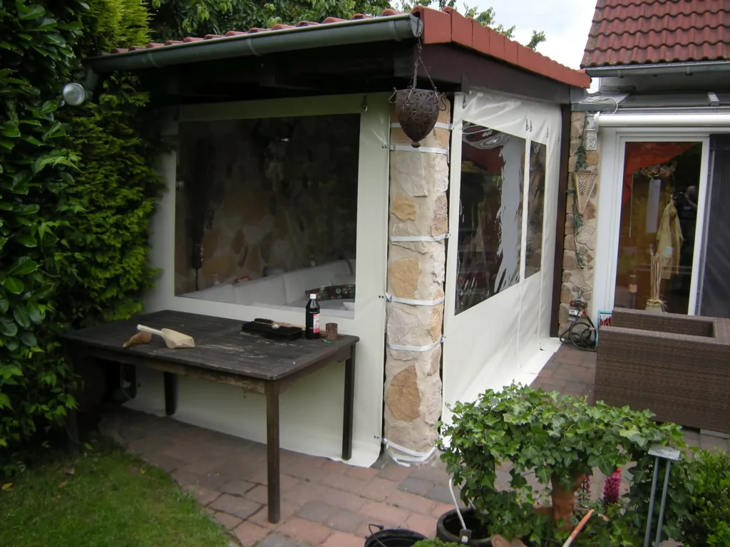 Unsere Terrassenplanen bestehen aus hochwertigem PVC-Planenstoff, der nicht nur robust, sondern auch langlebig ist. Sie verfügen über große Klarsichtfenster, die viel Licht durchlassen und gleichzeitig Schutz vor Wind und Wetter bieten. Die Planen können mithilfe von Kederschienen, Laufschienen oder Drehwirbeln einfach und sicher befestigt werden, während die Seiten der Plane zur zusätzlichen Stabilität umlaufend verstärkt sind.