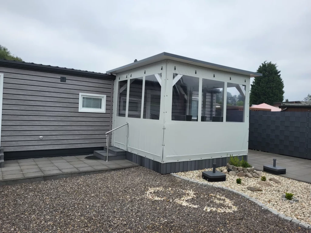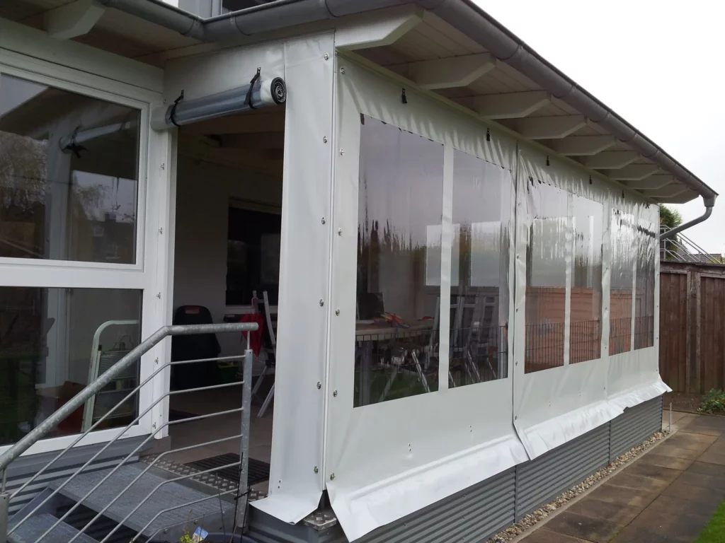 Unsere Terrassenplanen bestehen aus hochwertigem PVC-Planenstoff, der nicht nur robust, sondern auch langlebig ist. Sie verfügen über große Klarsichtfenster, die viel Licht durchlassen und gleichzeitig Schutz vor Wind und Wetter bieten. Die Planen können mithilfe von Kederschienen, Laufschienen oder Drehwirbeln einfach und sicher befestigt werden, während die Seiten der Plane zur zusätzlichen Stabilität umlaufend verstärkt sind.