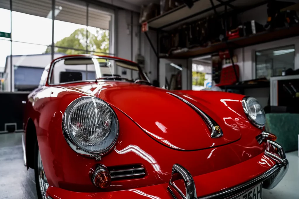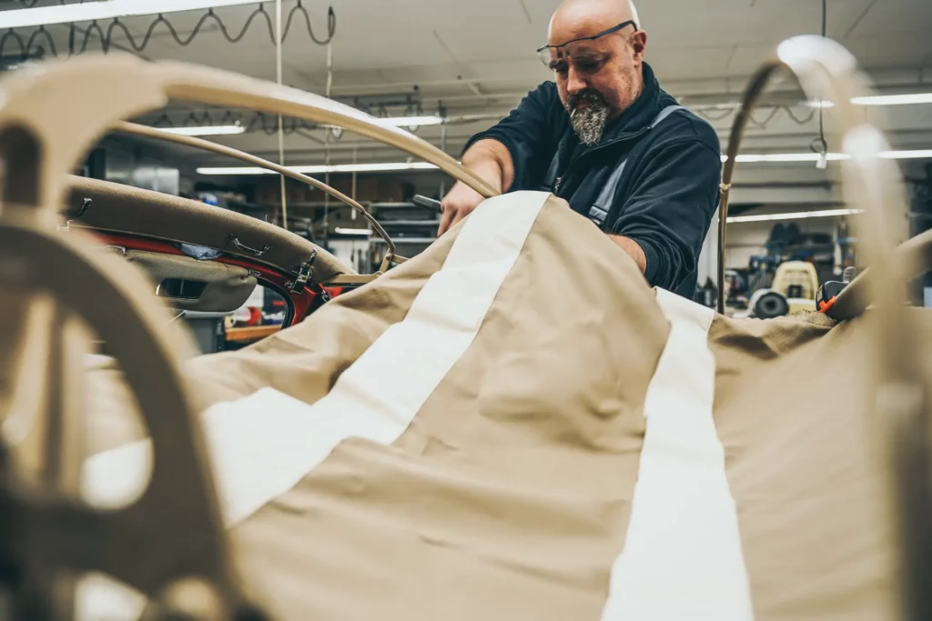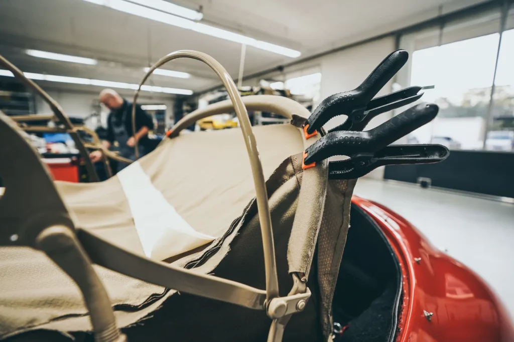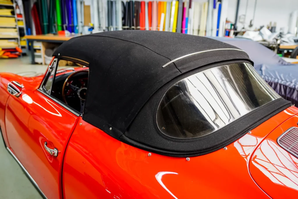 Bei diesem Fahrzeug haben wir den Innenhimmel erneuert, das Außenverdeck wurde vor einigen Jahren bei einer Restauration bereits erneuert und von uns übernommen. Das Verdeckgestell wurde eisgestrahlt und in Originalfarbe neu lackiert.